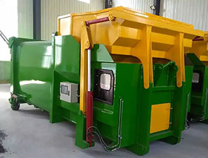 5、一種可卸式壓縮垃圾箱,由鉤臂車隨時轉場,只須供給三相電源,就能壓縮、轉運垃圾,適應于臨時性、突出性的垃圾清理清運任務。