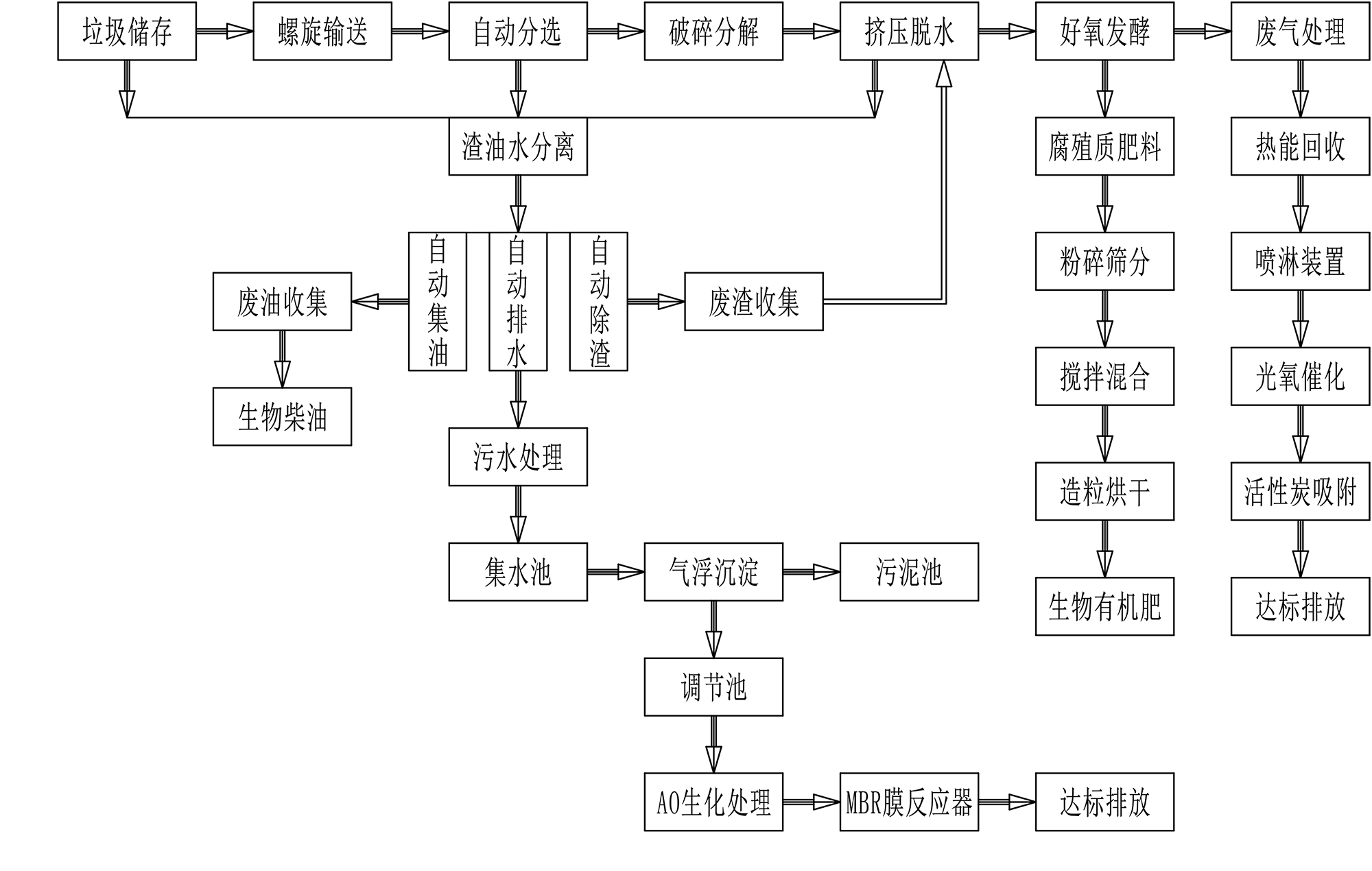餐廚垃圾綜合處理設(shè)備包括垃圾預(yù)處理、生化處理 、渣油水分離收集和廢水廢氣處理裝置組成;通過收集輸送、垃圾分選、剪切破碎、脫水?dāng)D干等預(yù)處理后,廢渣配合有益微生物菌在特殊環(huán)境下進(jìn)行好氧發(fā)酵,最終形成有機(jī)質(zhì)肥料;廢液通過渣油水分離后,廢油收集可提煉生物柴油,廢水經(jīng)物理和生化處理后達(dá)標(biāo)排放;整個處理過程產(chǎn)生的廢氣通過除塵,除臭和凈化后排入大氣。